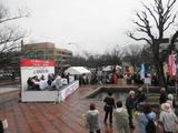 昨日からの続きです。 赤いTシャツの人々が大通りの特設ステージに向かって歩き出しました。 これから何かセレモニーが始まるようです。 壇上に若者が3人拡声器を使って何か…