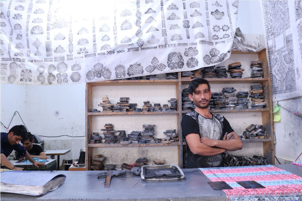 (バルーチデザインの布屋。6人ぐらいの技師がミシンで作業をしていた。棚に置かれているのは木でできたデザインスタンプ。撮影:筆者)
