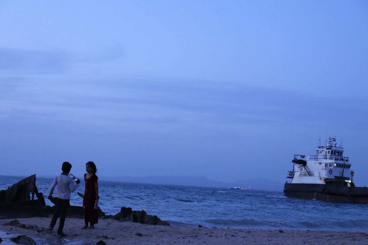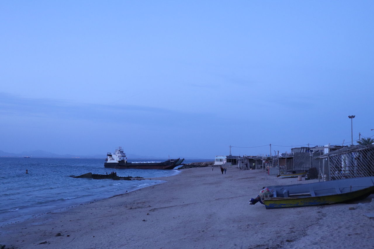夕方散歩がてらもう一度このバーザール海岸を訪れてみた。子どもたちが廃船の周りで遊び、大きな船がその近くを航行していた。