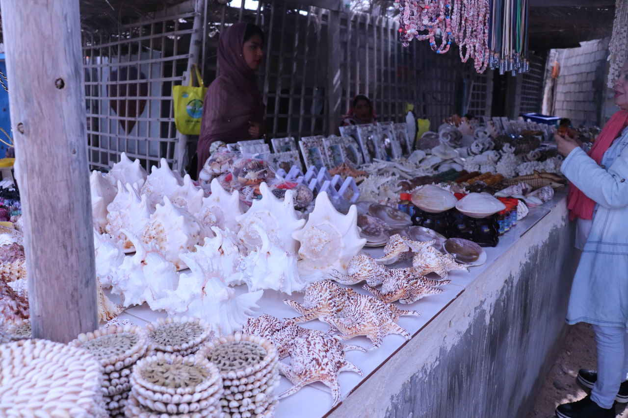 バーザールはどこかと聞けば、歩いて5分程だという。宿に荷物を置いて、早速出かけてみた。そうしたらそのバーザール、海岸線にあって、そして海の方に向かって建てられていた。私が行ったときには干潮で、バーザールから波打ち際まで20mほど距離があった。翌日訪れた時には満潮で、波打ち際がバーザールの入り口にまで迫っていた。きっと船で行き来をする人々目当ての商売なのであろう。この辺りはイルカウオッチングが有名で、結構な数の船が往来する。また漁業も当然やっているものと思われる。バーザールをぶらりとした限りは、貝がらを使ったアクセサリーや、サンボサ、日本語でいうサモサのお店など、生活感がないものばかりを売っていたから、きっと日用品のバーザールはここではないところにあるのだと思われる。
