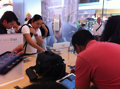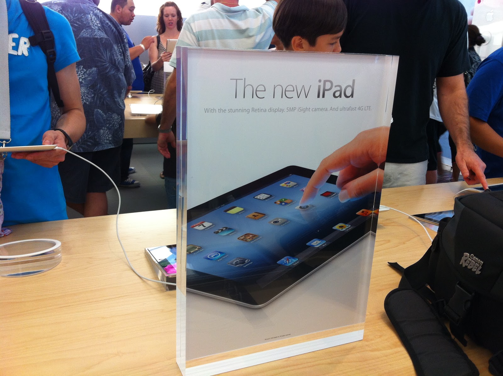 The new iPad!! いよいよ発売になりました。アメリカのAppleストアーは相変わらず大盛況でした。今回は、画像がよくなった事と、高速処理ということでたくさんの人が興味深くiPadに触れていました。