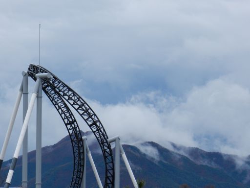 午後になって少し小ぶりになって、15:30には雲の切れ目から青空もチラホラ。歓声が上がったのは絶叫マシンの試運転が始まったから。