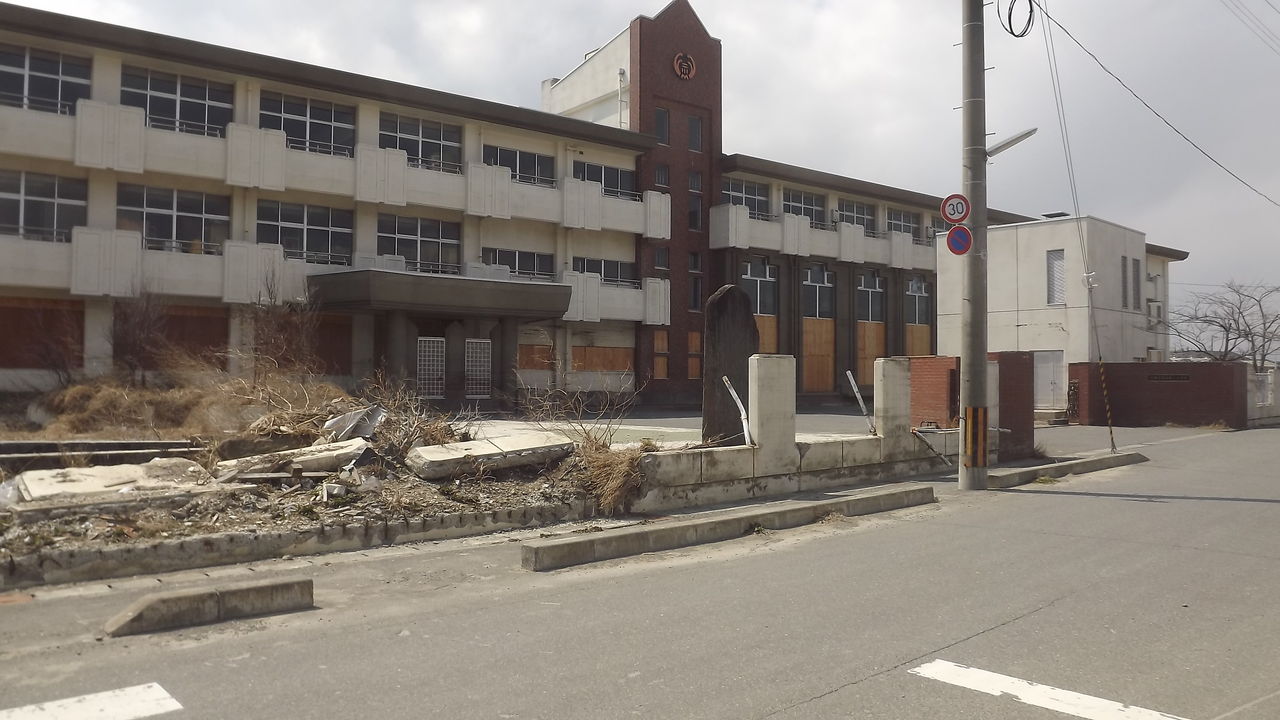 川沿いの雄勝中学校も