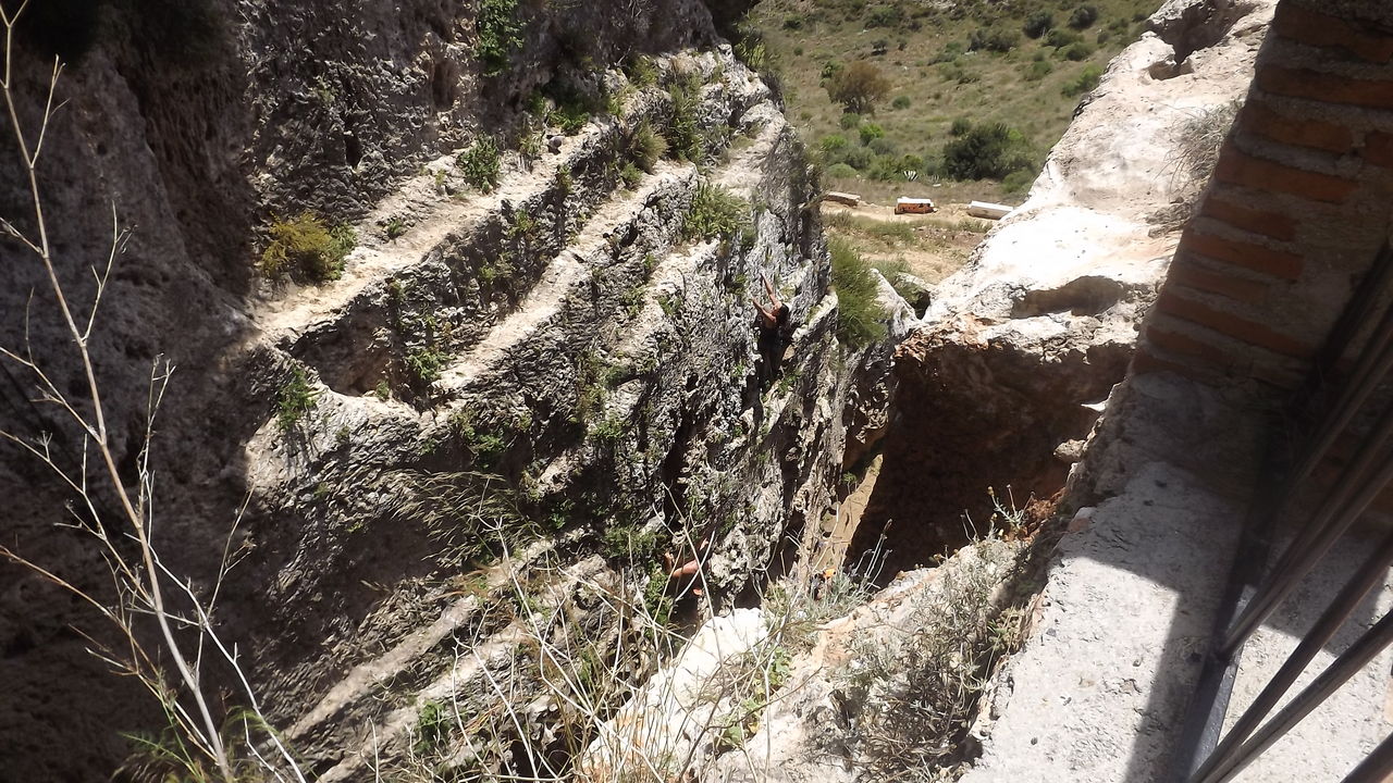 ロッククライミングをする若者