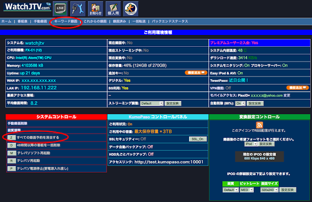 テ レパソにログインをしていただくと現れる "キーワード録画"のタブを開いてください。(この機能は古いシステムをご利用の方にはございません。現行の機種には標準装備です。) 予約を開始する前に システムコントロールよりZボタンですべての録画予約を消去してからご利用ください。(初めてキーワード録画予約ご利用の場合)