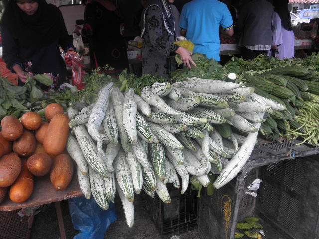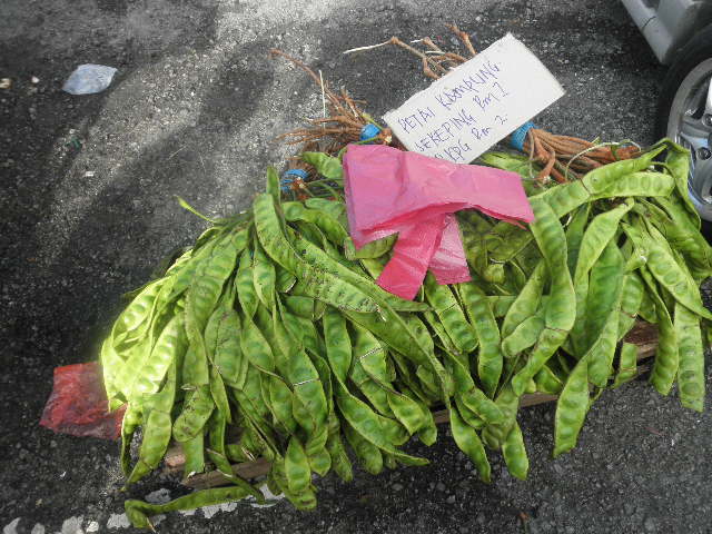 20日(日)朝から快晴。家内にとっては初のサンデーマーケット。私は魚を彼女は野菜を購入。やはり買い物になると女性の方が積極的だ。現地野菜(写真)の料理の仕方を隣のマレー人に聞いて買ったようだ。そのほかに茄子、カボチャ、生姜〆て7RM。