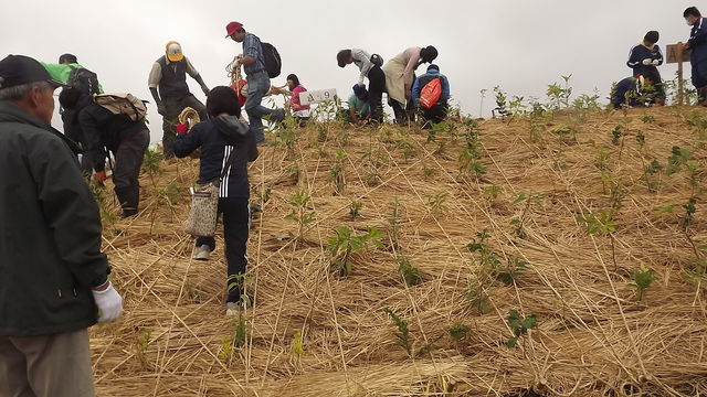 実際、これらの木が流されずに村の被害を和らげた例が多いのだと。今回の植樹祭でもこれらの他にヤブツバキ、コナラなど16種類の木を混ぜて植えた。いずれも、根が真っ直ぐに深く地下に入る直根性、深根性があるために、容易に倒れず波砕効果を持つのだという。瓦礫を土と混ぜることの意味がここにあるのだと。