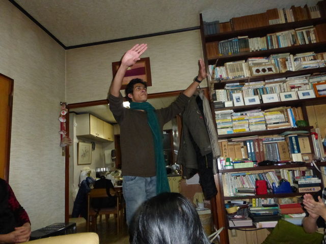 2014年1月1日(水)曇時折雪がちらつく。あけましておめでとうございます。昨夜は大阪の息子家族を除き、近くに住む娘家族、それに声をかけたスリランカの留学生Rさんが同じ留学生の2人の男性留学生を連れて我が家に来て大賑わいだった。K君はスリランカの歌を披露、J君は見事な手拍子。