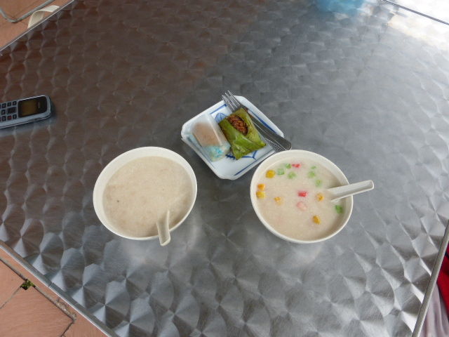 歩き始めて30分くらいで、夜が明けてくる。小雨決行となっているが、雨に遭ったことはほとんどない。脚力に差があるから、途中隊列を確認しながら時間調整をする。50分ほどで街に着き、朝食となる。私はピータン入りの粥に決めているが、めいめいで注文する。