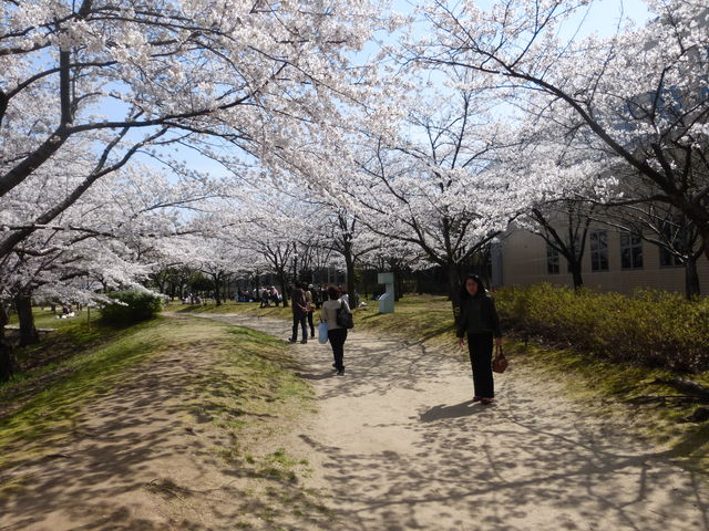 13日(日)快晴。風もなく桜は満開。花見に出ない手はない。おにぎりを握って先ずは県立図書館へ。ここの桜はソメイヨシノは勿論、しだれ桜や大島桜、山桜まで。家族連れで一杯。孫崎享氏著「小説外務省尖閣問題の正体」を借りに寄ったのだが、まだだった。