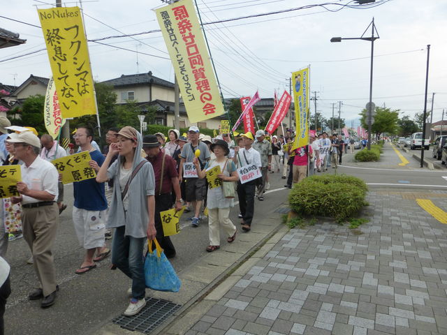 盛りだくさんの内容で、しかもどの発言も重い内容で「福島に学べば再稼働などあり得ない」と。集会宣言には震災関連死が1700名に達し、子供89人に甲状腺癌(疑いも含む)が見つかっていると。地元民に「勇気をもって原発と決別して欲しい」と呼びかけも盛り込んだ。その後デモ行進に移る